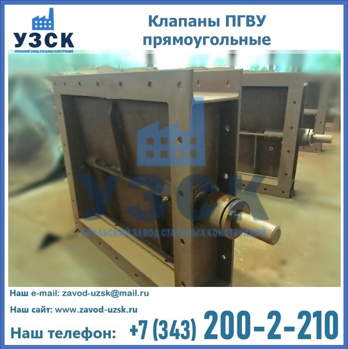 Прямоугольный клапан ПГВУ имеет прямоугольную или квадратную форму, по основному сечению конструкции, на которую устанавливается клапан. Для изготовления шиберов ПГВУ в Березниках применяются сталь нержавеющая, углеродистая или низколегированная, в зависимости от модели. Внутри клапана имеется запорный элемент, передвигающийся параллельно общему потоку движения среды. Запорный элемент, или створка имеет такую же форму, как и основное сечение. Перемещение створки происходит благодаря возвратно-поступательным движениям.