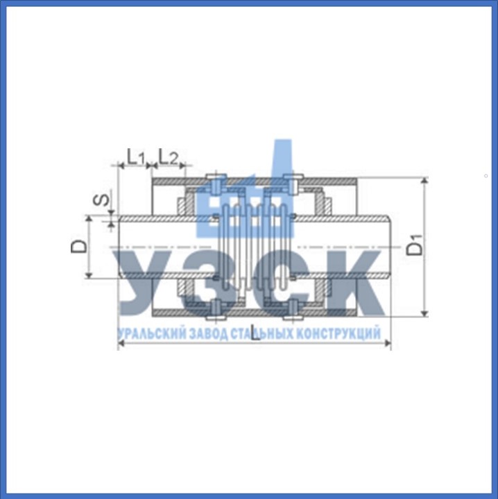 | Условное обозначение | Усл. диаметр DN, мм | D, мм | D1, мм | S, мм | L, мм | L1, мм | L2, мм | Осевой ход, ±λ мм | Жесткость, Сλ, H/мм | Масса, кг |